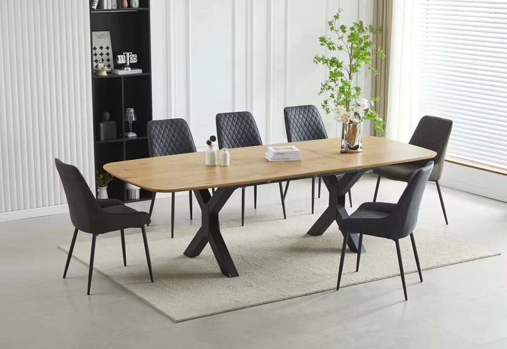 木の温もりと洗練されたラインを融合させた、北欧モダンデザインのダイニングテーブル。